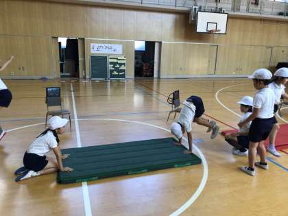 前転をします。グループのメンバーで選手にアドバイスをするコーチ。