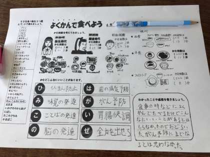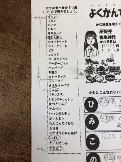 食べ物とかむ回数の変化や、よくかむ事でどんな良いことがあるのかなどを学びました。自分たちが好きな食べ物は、やわらかいものが多いということも分かりました。