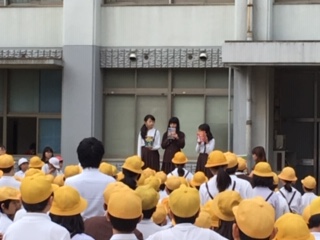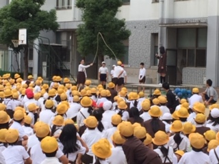 集会委員会による「長縄とび」をしました。縄をジャンプ!縄をくぐり抜ける!縄に入って2回ジャンプ!それぞれできることに挑戦しました。さらに上級者は「イェーイ!」と言いながら跳びました。