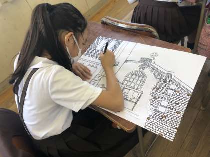 レンガ一つ一つを細かく描き、ていねいに塗っていきます。