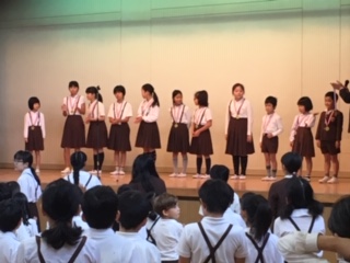 一昨日に行われました本田まつりで催された「豆つかみ」の各学年上位2名が発表されました。壇上で金メダルが授与されました。みんな鼻高々です。