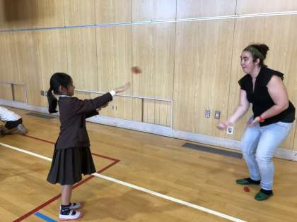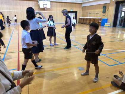 視察に来られた方々と3年生が昔遊びを一緒に楽しみました。