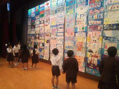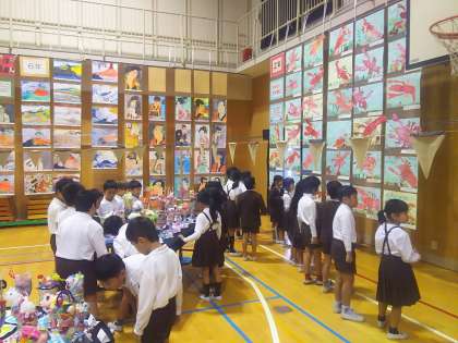 作品展を1、2年生一緒に鑑賞しました。ペアになって、お互いの作品を見合ったり、他の学年の作品を一緒に見たりしました。