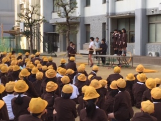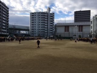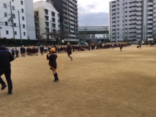 転がしたり、縄跳びのように跳んだり、腰で回したりと学年によって違う動きでチャレンジしました。