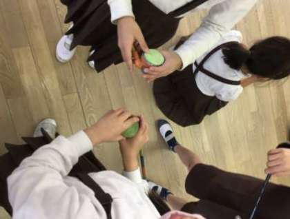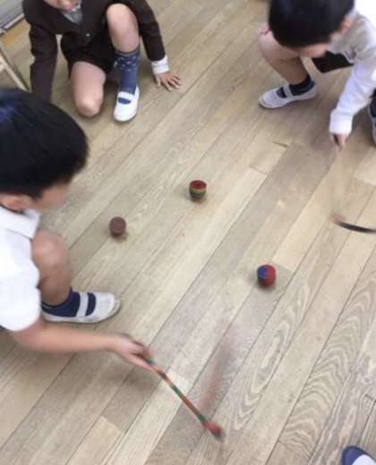 これは韓国のコマ回し(ペンイ)で遊んでいるところです。韓国のコマは、紐で叩くようにして回します。