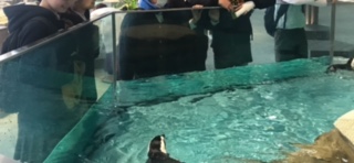 ペンギンの泳ぎを見るみんな(下の写真)