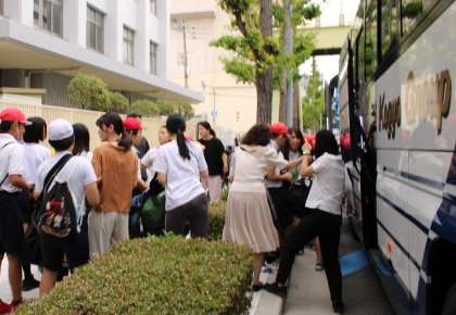 6年生は、今日から1泊2日の予定で、鈴鹿方面へ修学旅行に出発しました。出発式では、代表の児童の「楽しい修学旅行にするぞ!」のかけ声に続き、みんなで「オー!」と言って気持ちを盛り上げていきました。