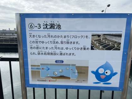 甲子園12個分の広さがある柴島浄水場で、淀川からとった水を実際に綺麗にする池を順番に見学しました。「めっちゃ広い」「あ、池の中でかき混ぜてる」「ホンマに綺麗になってるわ」など感想を言いながら見学しました。