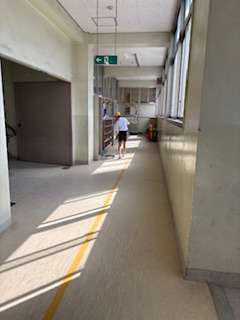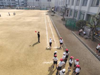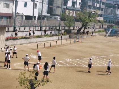 体力テスト2日目、午後から6年生は50m走、ソフトボール投げの記録を測定しています。いいお天気で気温が上がる中、水分補給をしながら、がんばっていました。