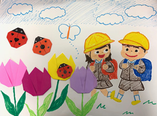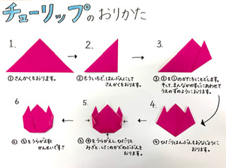これまでに しょうかいした おりがみは、チューリップ、てんとうむし、こいのぼり、かぶと、そして、かざぐるまとあやめです。
