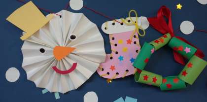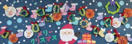 リースや長ぐつ、トナカイ、雪だるまなどを1人1つずつ作りました。リースは、色画用紙を丸めてリボンでつないで作りました。長ぐつは穴をあけて毛糸を通し、星や丸のシールをはって、カラフルにしました。みんなが作ったものをつないで飾ると、とても華やかで楽しい飾りになりました。