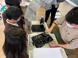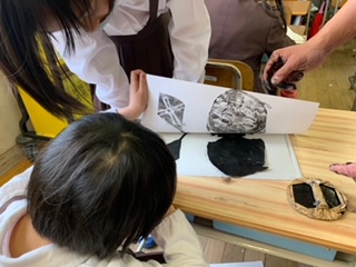 図工の時間には、紙版画を刷り、作品が出来上がりました。ローラーでインクを付けたり、バレンでこすったり、初めての版画を楽しんでいました。和紙をめくって、きれいに作品が写った時には、歓声が上がりました。