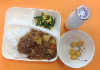 今日の給食は「ハヤシライス、牛乳、三度豆とコーンのサラダ、さくらんぼ(缶)」です。