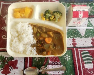 冬野菜のカレーライスの献立に、ハートなどのラッキーにんじんを入れました。