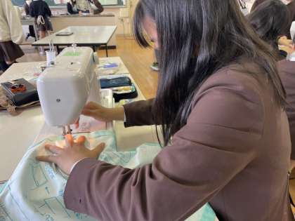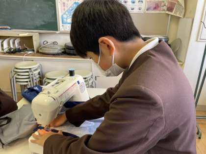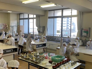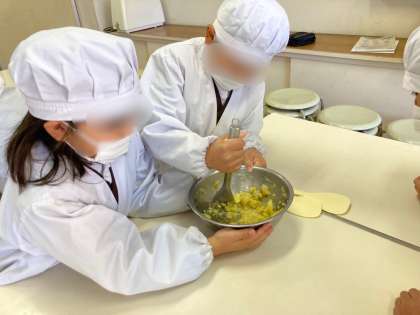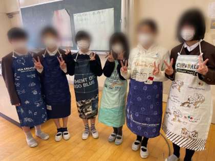 初めての調理実習、初めての家庭科室での活動に、子どもたちは大興奮。栄養教諭の黒野先生にも手伝っていただきながら、班で協力して、手際よく作ることができました。