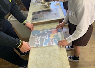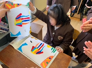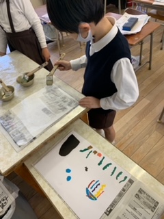 図工の時間は、版画を刷りました。和紙に水をつけて、版の上に置いてこすります。和紙をめくると、色鮮やかなスイミーや海の様子がうつっていて、子どもたちは大喜びでした。楽しい作品がたくさん出来あがりました。