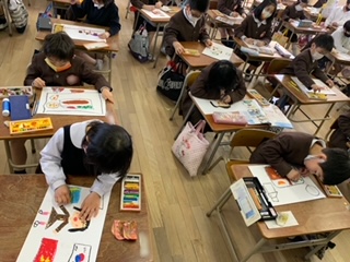 また、入学式の時に教室に飾る絵も描きました。1年間を振り返って、楽しかったことや新しい1年生に教えてあげたいことを思い出して描きました。「そんなこともやったなあ。」「懐かしい!」など、口々に言いながら、嬉しそうに描いていました。