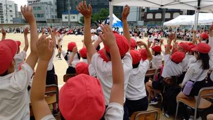 5月27日(火)、土曜日に引き続き運動会を行いました。まずは応援合戦でオープニングを飾ります。前回に負けず劣らず、元気いっぱい応援していました。
