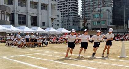 3年生の団体競技です。チームワークが鍵となるこの競技。どのチームも棒を持つ4人の息がぴったりと合っていました。