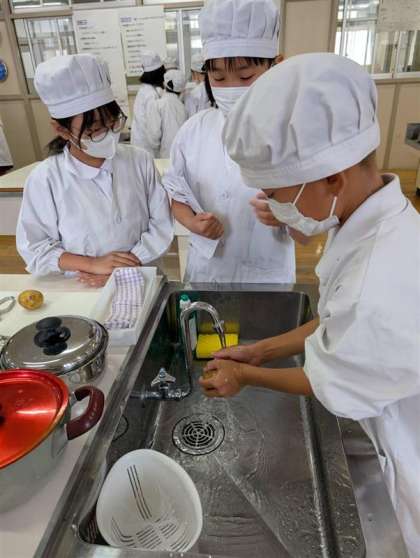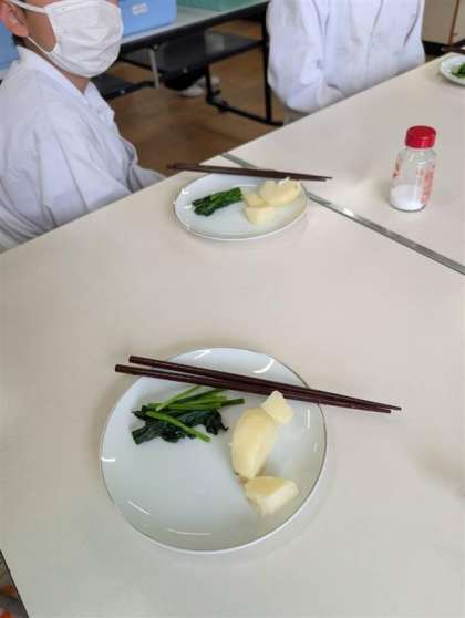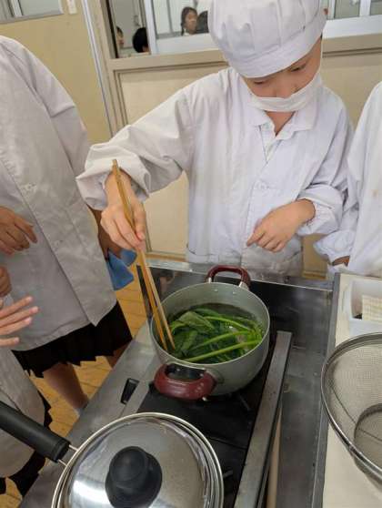 5年生から始まった家庭科の学習。今日は初めての調理実習です。ほうれん草とじゃがいもをゆでる学習を通して、食材の切り方やゆで方などの基礎知識や技能を身につけます。班で協力しながら安全に調理することができました。