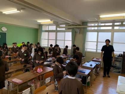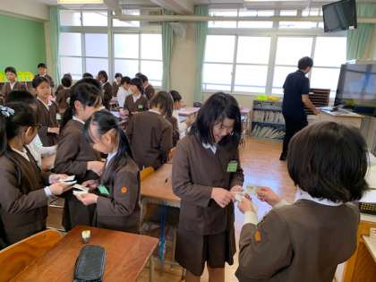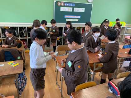本時のめあては、「business cardを交換しよう」既習のあいさつを使い、名刺交換を行いました。この活動でも、主体的に活動していました。