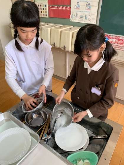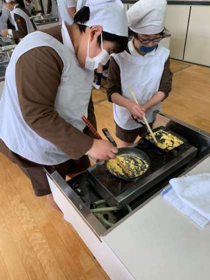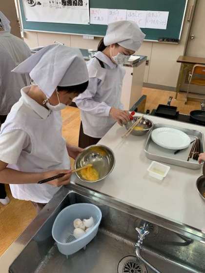 6年生になって初めての調理実習を行いました。一人ひとりが自分のスクランブルエッグを作りました。準備から片付けまで協力して活動することができました。