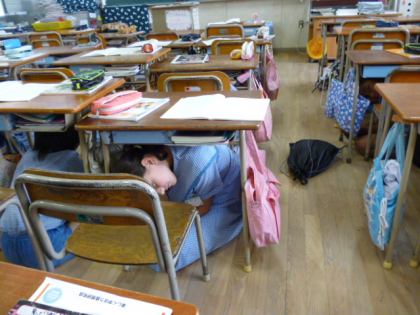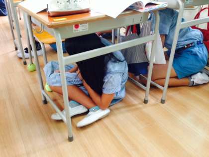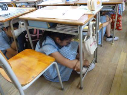 「訓練・緊急地震速報 強い揺れに備えてください。」の防災行政無線放送のあと、教室や講堂で授業を中断して、避難訓練に参加しました。