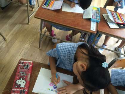 今日の生活科の授業では、自分で育てたあさがおのたねを来年の1年生へのプレゼントにするために準備をはじめました。まずは、ひとりひとりに渡すための、たねを入れるふくろ作りです。みんな、あさがおや春らしい絵を思い思いに描いています。どんなふくろができるかな。