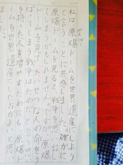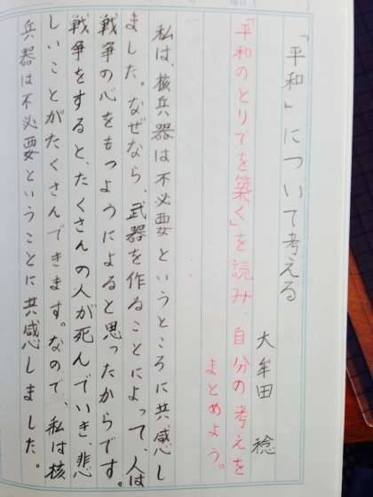 今日は、「平和のとりでを築く」の文を読み共感すること、疑問に思うこともっと知りたいことについて自分の考えをまとめました。
