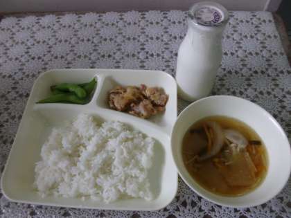 今日の給食は、「ごはん、鶏肉のねぎ焼き、ソーキ汁、枝豆、牛乳」でした。ソーキとは、豚のあばら肉のことです。給食のソーキ汁には豚のばら肉を使い、こんぶやとうがん、にんじんなども使っています。一口大に切ったとうがんが、だし汁を吸いとろとろに柔らかくなって、とても食べやすくなっていました。鶏肉のねぎ焼きも、こんがりジューシーに焼き上がりました。盛り付けると枝豆の緑色が鮮やかで、食欲がそそられました。