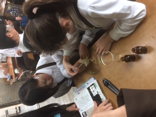 「インゲン豆の発芽ための養分がどこにあるのだろう」という疑問を解決するために実験を行いました。安全眼鏡をつけてヨウ素液を使う実験に子どもたちは興味津々。とても意欲的に実験を行う姿が素晴らしかったです。