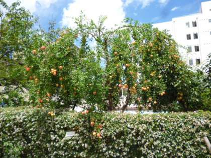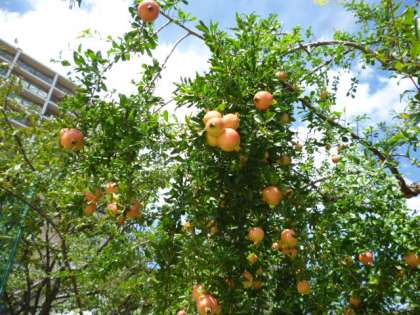校庭の植え込みのざくろが、たわわに実をつけています。もう少しで実が熟して裂けそうです。