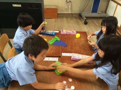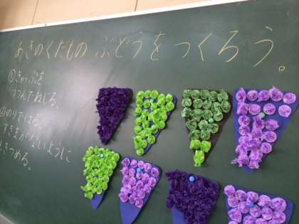 今日の図工は、秋の味覚ぶどう作り。ぶどうの材料には、いつも給食のときに飲んでいる牛乳のキャップを使います。キャップをおはながみで包んでつぶつぶを貼りつけて完成!のはずが… たくさん集めたのにキャップがたりませんでした。続きはまた明日ね。