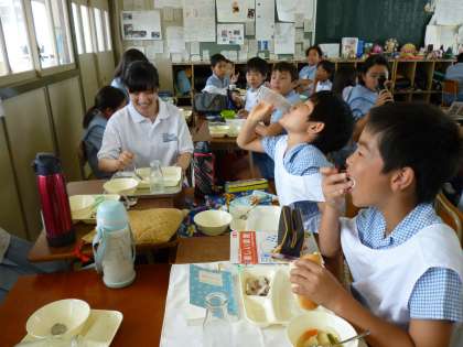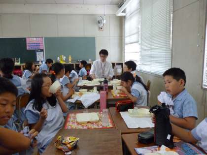 理科支援の先生や教育実習の先生と楽しい給食です。