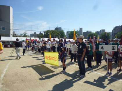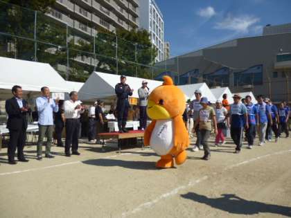 入場行進では、こどもレスキュー隊が先導し、区内14連合のみなさんが続いて入場され開会式が始まりました。