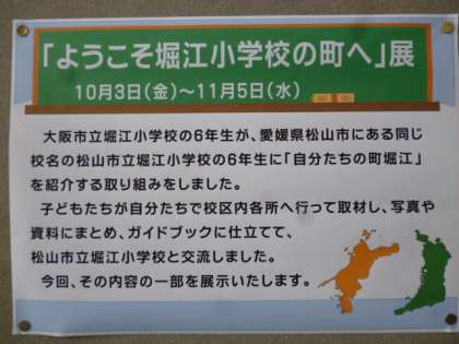 6年生が、松山市立堀江小学校との交流で作製した「堀江ガイドブック」を中央図書館の1階ロビーに展示していただいています。11月5日まで展示していますので、みなさんぜひご覧ください。