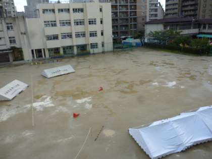 写真は、昨日予定されていた堀江幼稚園の運動会が延期となり、台風に備えてテントの支柱を折って低くして避難いる様子です。