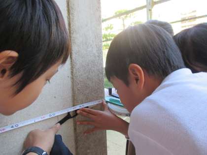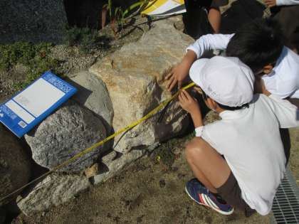 算数「長い長さをはかろう」の学習でまきじゃくを使いました。グループで協力して、人工芝の長さや柱のまわり、池のそばの築山のまわりの長さをはかりました。