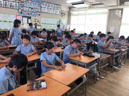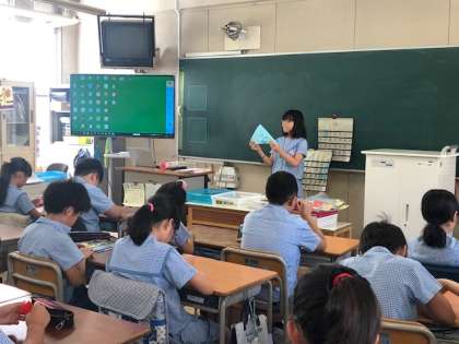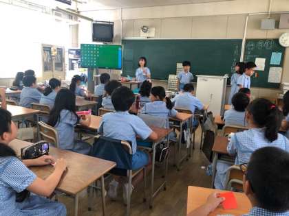 広島平和記念資料館では、平和を祈念して千羽づるを捧げます。そこで、6年生が鶴の折り方を教えに教室に来てくれました。とてもわかりやすい説明で、5年生も真剣に心をこめて折りました。