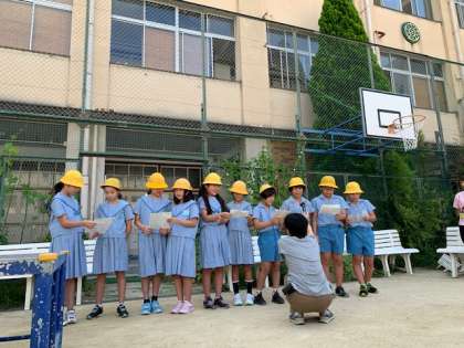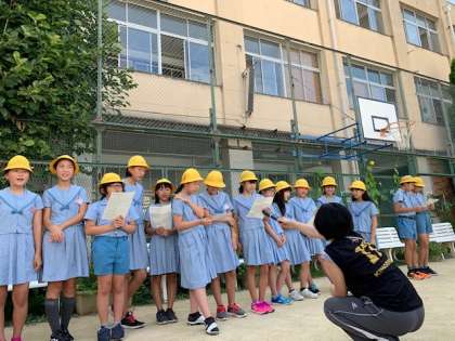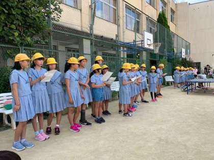 全校朝会で健康委員会が作成した『おどるポンポコリン』の替え歌を発表しました。