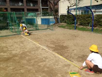 折れ曲がる部分に苦労しながらも、友だちと協力して長さをはかっています。