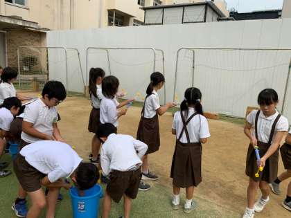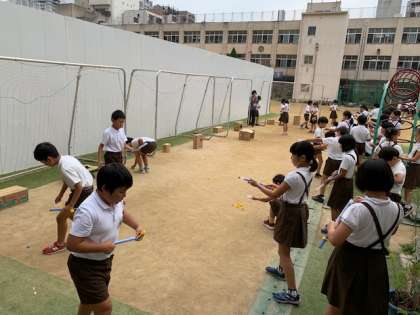 ダンボール箱を的にして、水の量を変えたり空気を入れてみたりと試行錯誤しながら主体的に取り組んでいました。