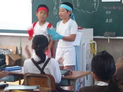 6年生が修学旅行でお留守なので、サブリーダー5年生が、1〜4年生の教室へ行き、応援合戦についてお知らせしました。