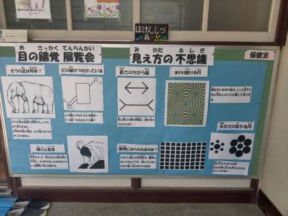 保健室前には『目の錯覚展覧会 見え方の不思議』が掲示しています。