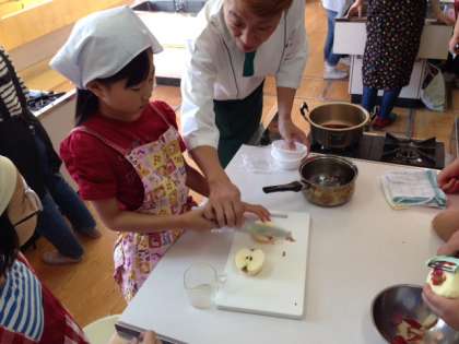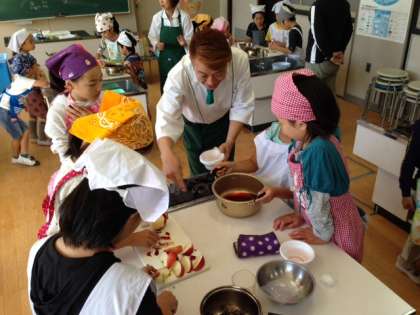 堀江子ども会で、料理教室が開催されました。講師に来ていただいたのは、新町1丁目の「ル・シノワ」の播 賢知(ばんさとし)先生です。播先生が来ていただいて、今年で4回目になります。今日の献立は、(1)きのことベーコンのスープ(2)ポークのチーズ巻揚げ(3)リンゴのコンポートです。家庭科室で、40人の子どもたちは先生の話をよく聞いて、怪我をしないように気を付けながら、夢中になって料理を楽しんでいました。