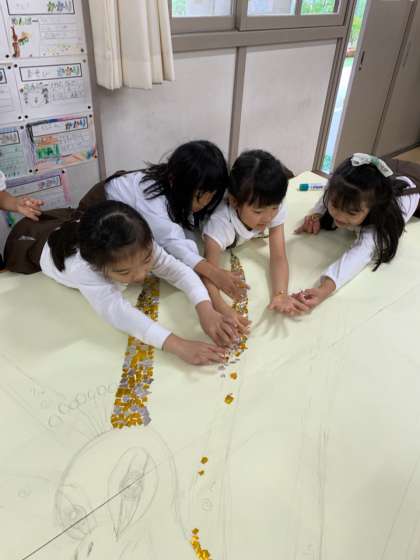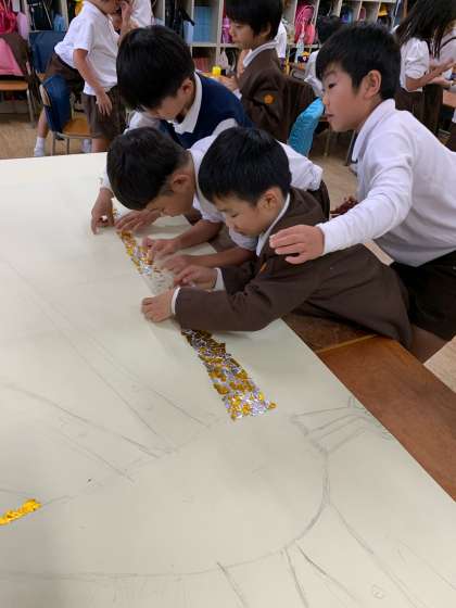 作品展で飾る、幼小合同作品の大きな作品を進めました。