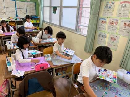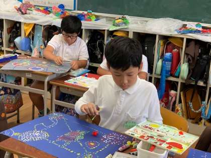 4年生は、「アボリジニアート」という平面作品に取り組んでいます。オーストラリア原住民発祥のアートとして知られています。