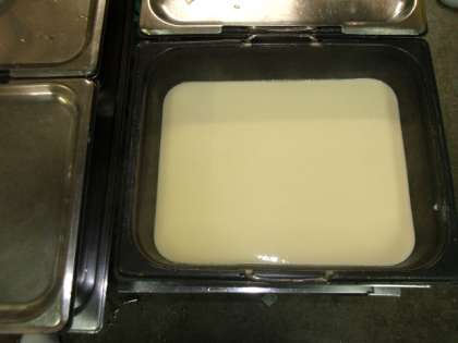 卵どうふは、卵とだし汁を合わせ、クラスごとにミニバットに入れて、給食室の焼き物機で蒸して作りました。けずりぶしでとった濃厚なだしのうま味が生かされ、みりん、塩、うす口しょうゆで味つけした、つるんと食べやすい一品でした。