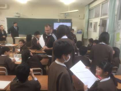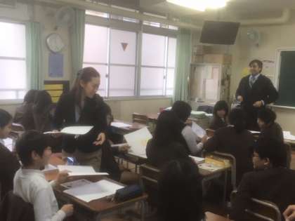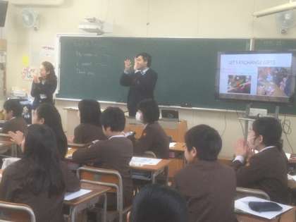 堀江中学校の先生に来ていただき、C-NETの先生と一緒に6年生の学級で英語の授業をしていただきました。クリスマスプレゼントを渡す練習では、うれし恥ずかしそうに英語で会話できていました。
