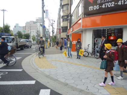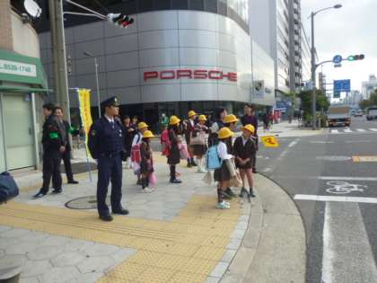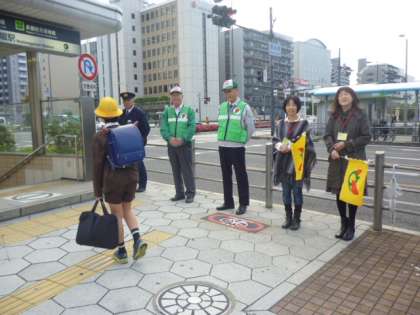 通学路の交差点で、地域の見守り隊のみなさん、PTAのみなさん、警察官に子どもたちの登校の安全を見守っていただきました。
